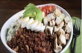 Chicken, avocado, bacon, bleu cheese, diced tomatoes and sliced egg piled on a bed of fresh iceberg and romaine lettuce mix.